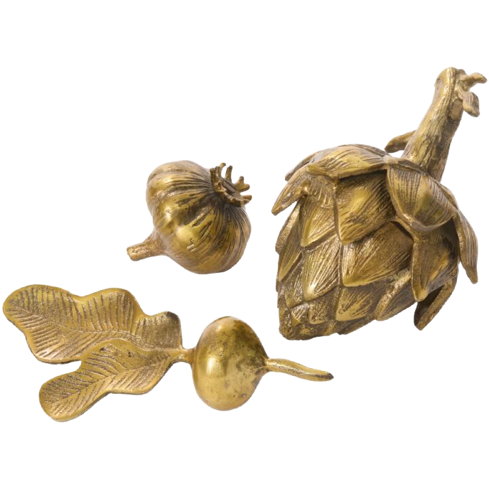 The Gilded Vegetables collection features three distinct styles—garlic, radish, and artichoke—each expertly crafted to bring a touch of elegance to your home décor. These decorative pieces showcase intricate detailing with a luxurious gilded finish, making them perfect accents for adding sophistication and natural charm to any room. Ideal for display on shelves, tables, or kitchen spaces, they blend artistry with refined style.